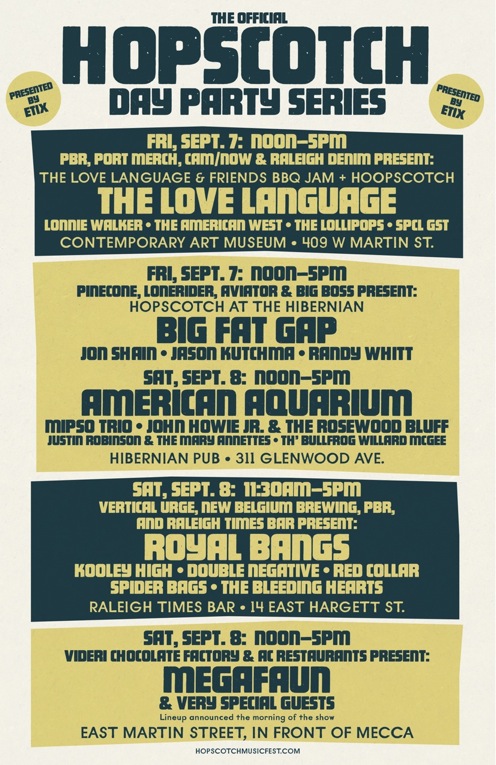 Today, in keeping with that overall growth, we are very happy to announce the Hopscotch Day Party Series Presented by Etix. As part of some 30 day parties happening throughout the city, Hopscotch has worked with Etix and many other partners to bring you four shows that could be considered a festival on their own. They include a two-day stand of distinctively North Carolina music at Hibernian Pub on Glenwood Avenue, a charity basketball game, concerts curated by Megafaun and The Love Language, and a street party full of some of the region’s favorite band in front of Raleigh Times Bar. In the past, Hopscotch has presented only one official day party, but in response to the energetic reception to the festival and the enthusiasm of you, the fans, we’ve opted to do more. Additionally, various record labels, blogs, restaurants, breweries, comedians, and others have worked to provide Hopscotch attendees with a bigger and more diverse roster of daytime activities. Four weeks from today, Raleigh will feature more live music—and as much fun—as at any time in its history.